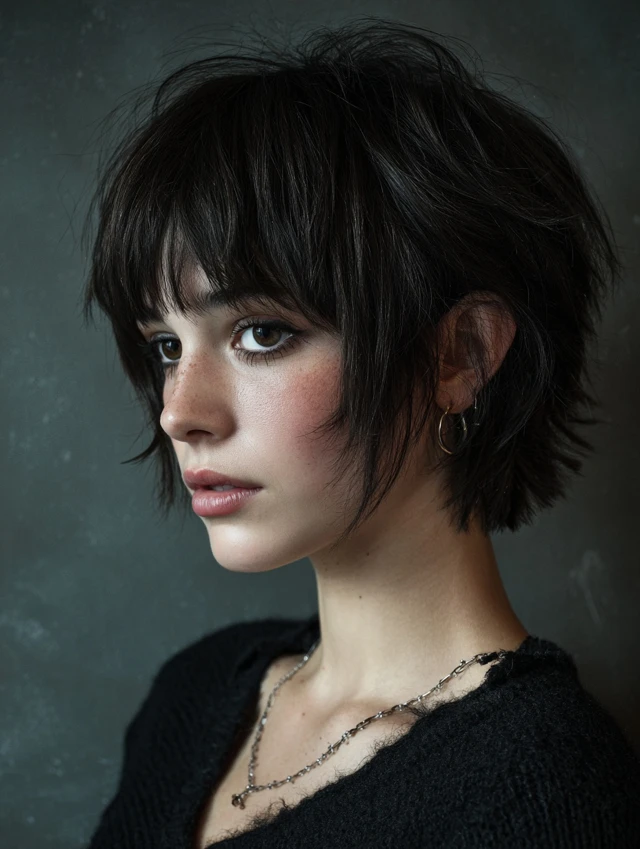 Short pixie in the front, slightly longer back layers, textured edges.