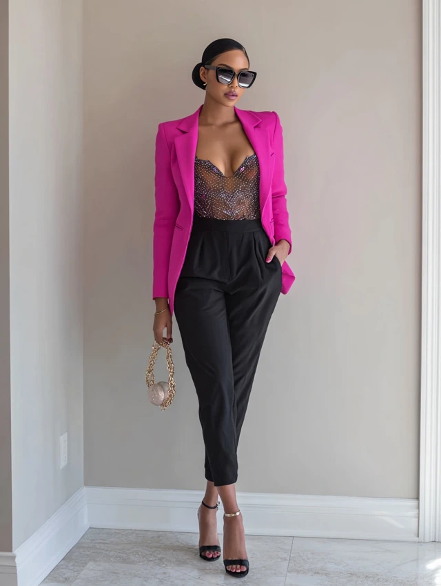 2. Hot Pink Blazer + Black Bodysuit + Trousers