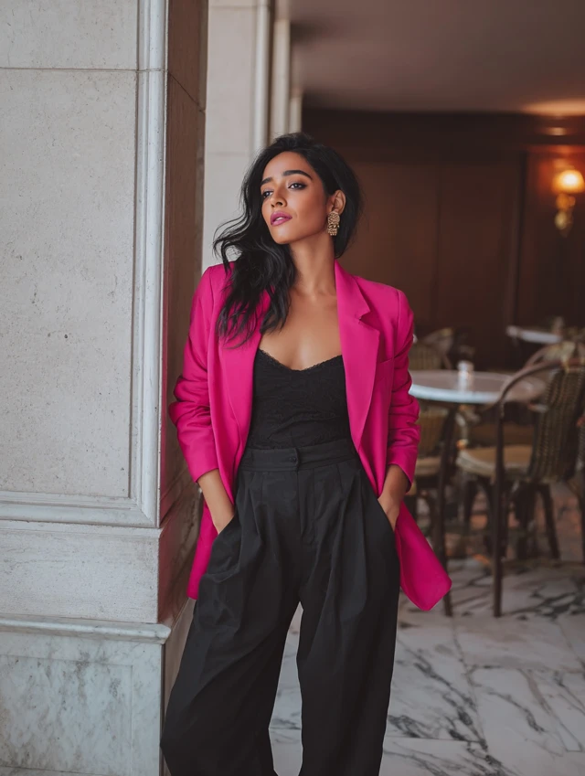 The beauty of a pink blazer lies in its balance — it’s bold but approachable, professional yet playful.