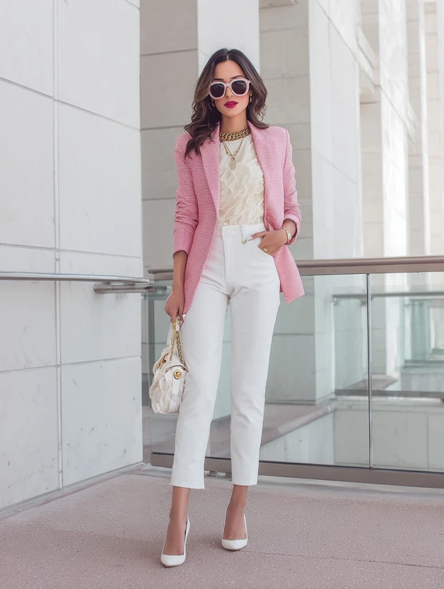5. Pink Blazer + White Trousers