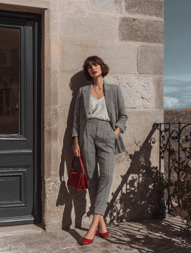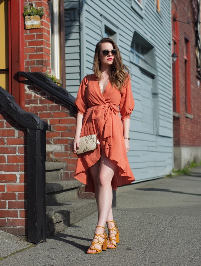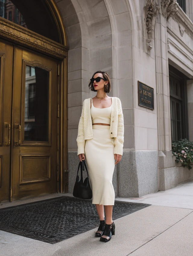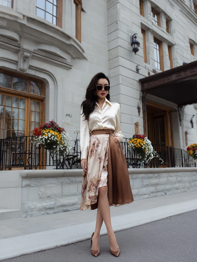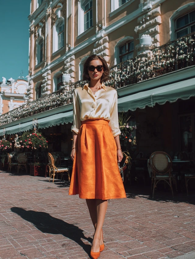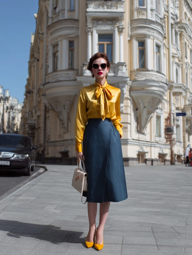 - Footwear: Block heels, pointed pumps, strappy sandals, or elegant flats.