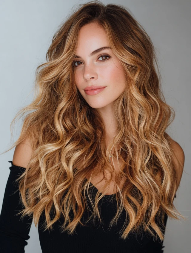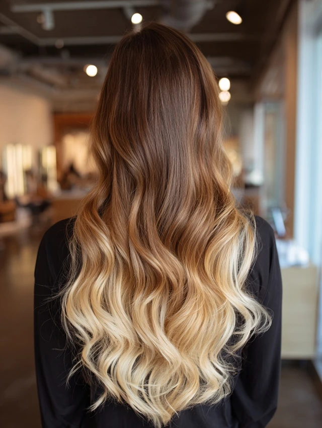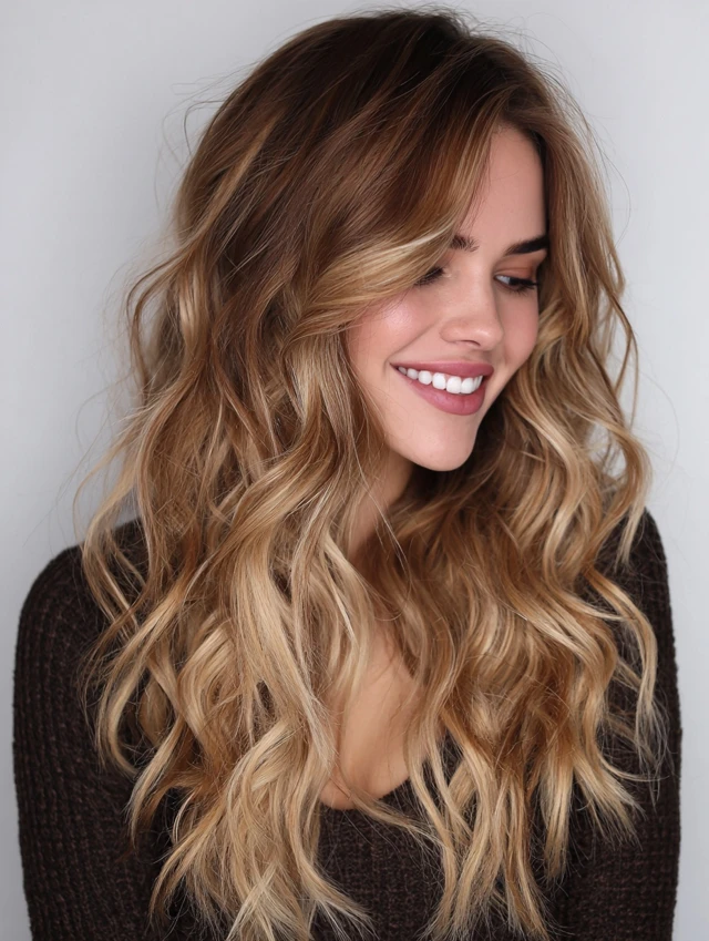 Loose waves emphasize the gradient from brown to blonde, creating a soft, blended finish.