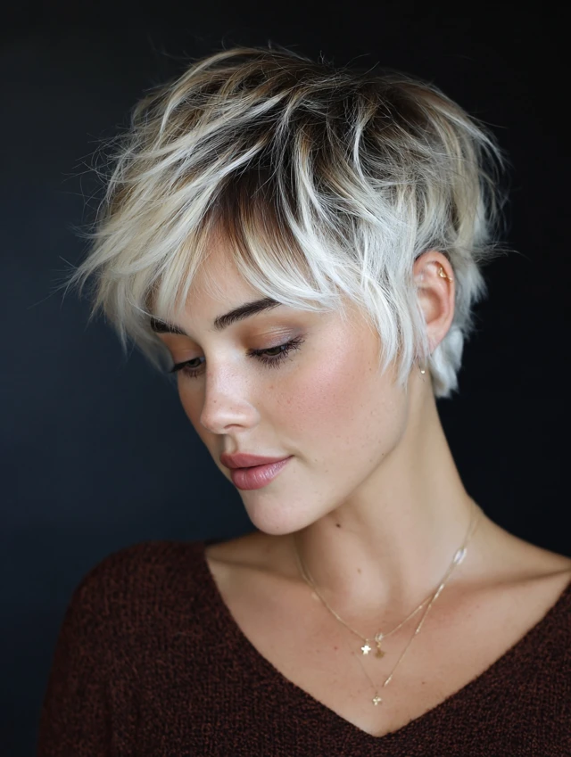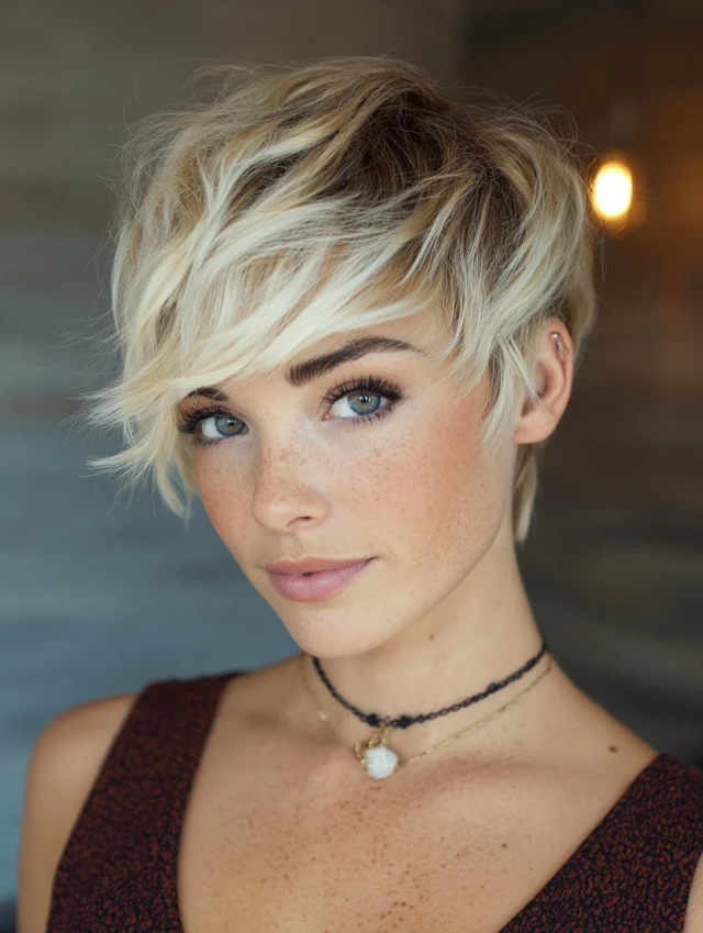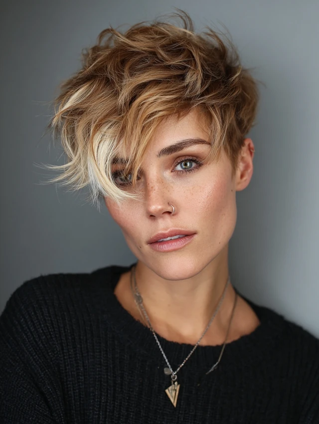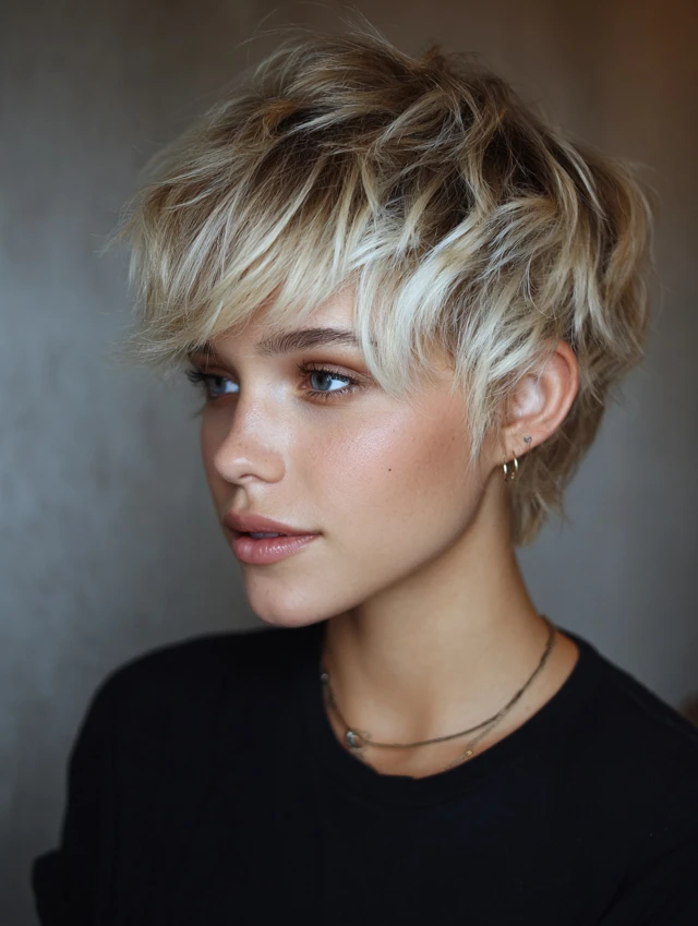 Short, textured layers combined with blonde tips create a playful, edgy vibe.