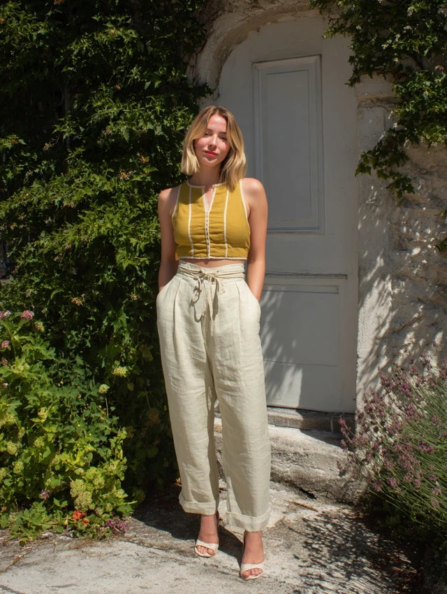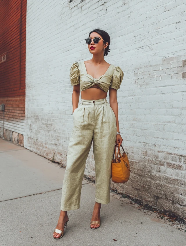 • Top: Cropped blouses, tank tops, button-down shirts, or light knits.