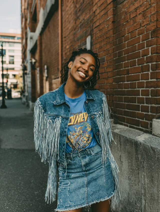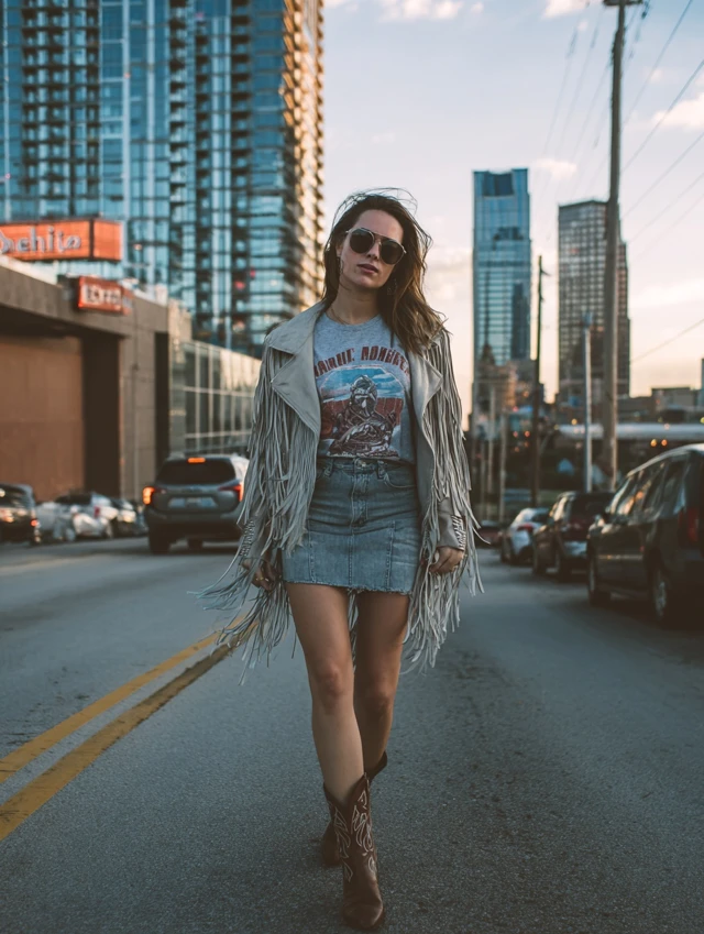 - Outerwear: Denim jackets, suede vests, leather fringe jackets.
