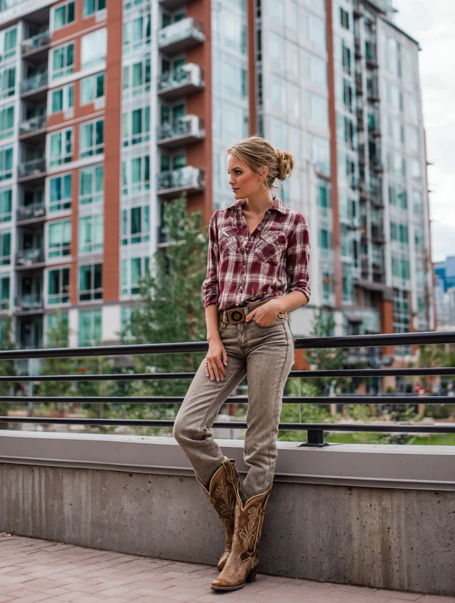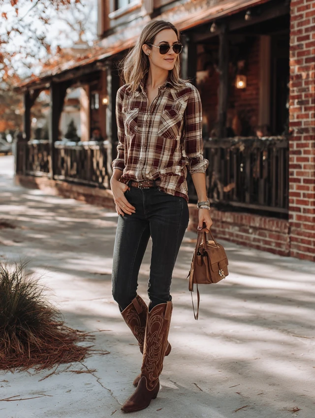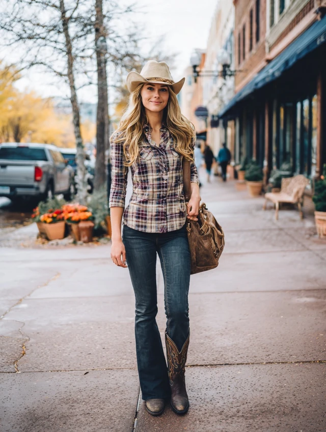 1. Bootcut Jeans + Plaid Shirt + Cowboy Boots