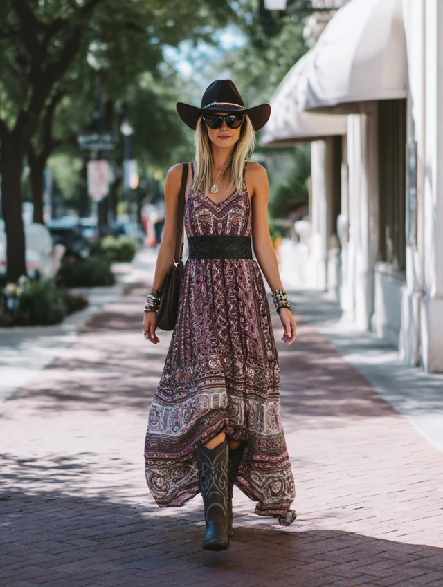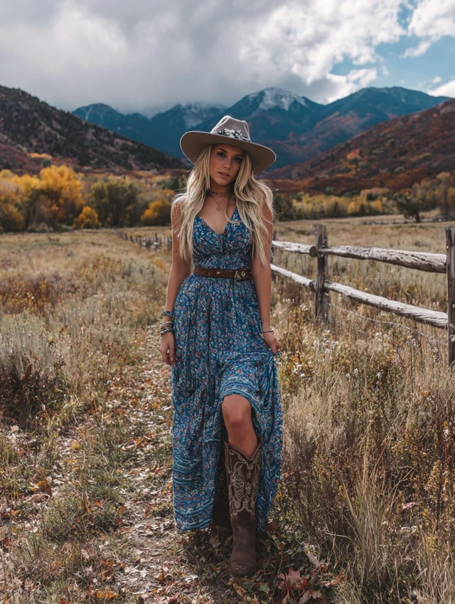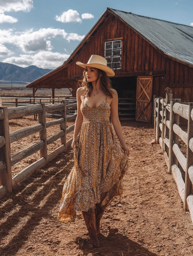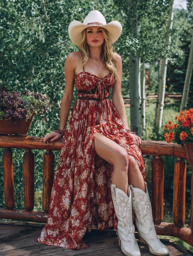 - Footwear: Cowboy boots (classic or white), heeled ankle boots, or rustic sandals.