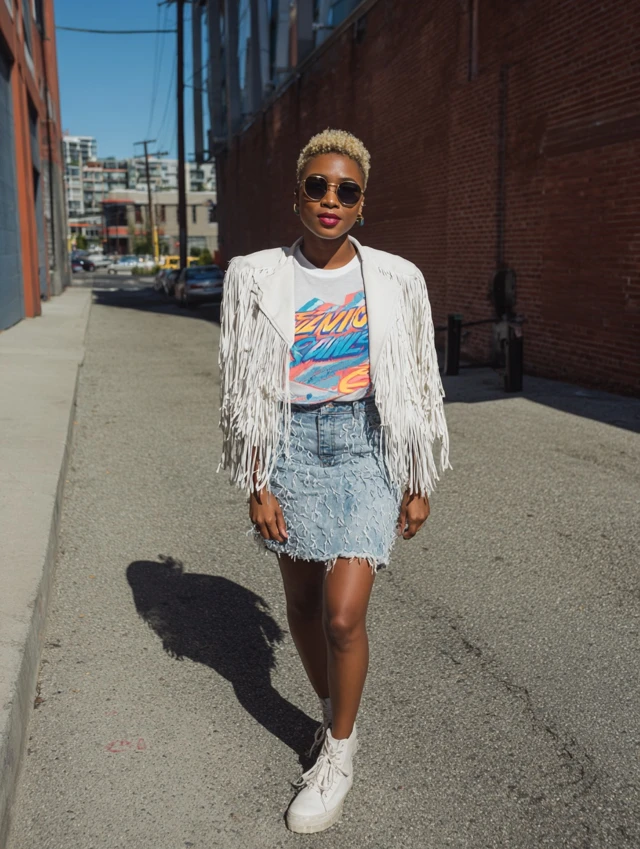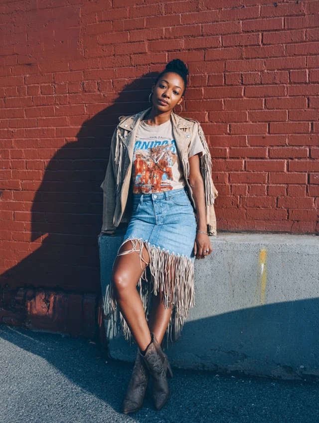 2. Denim Skirt + Graphic Tee + Fringe Jacket