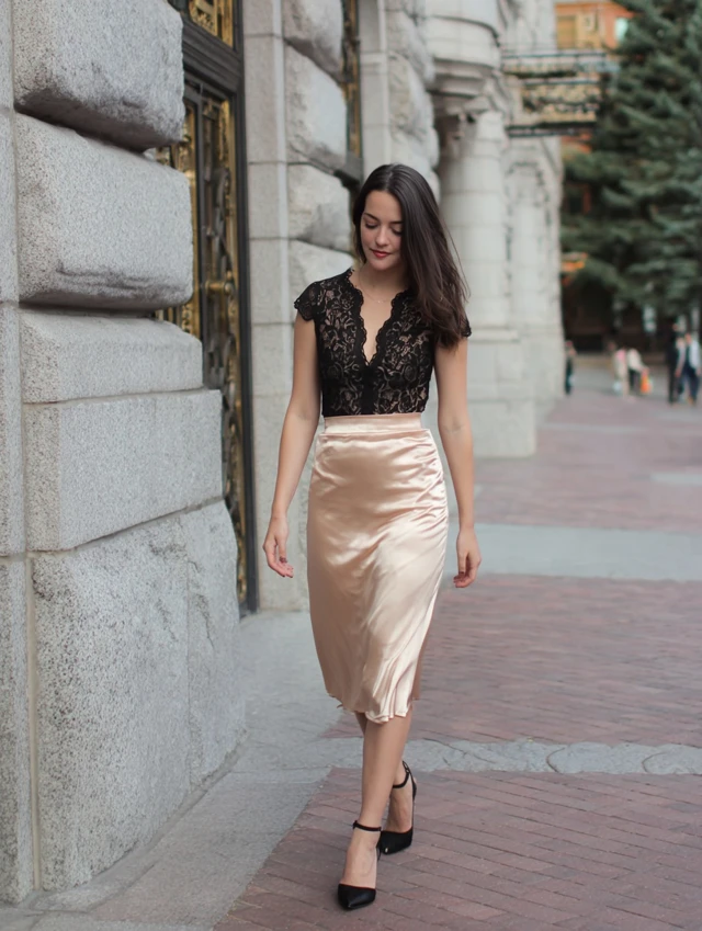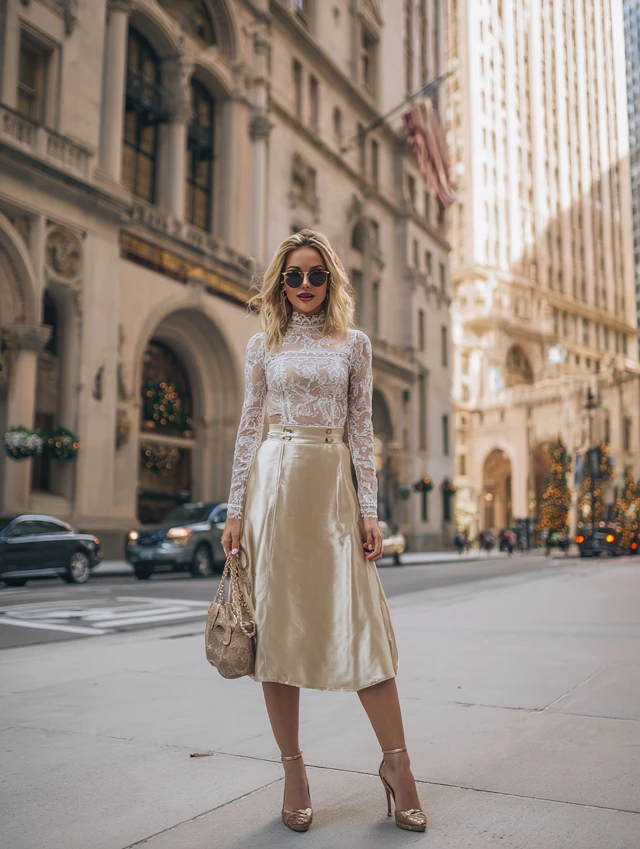 Holiday outfits thrive on rich tones and luxe fabrics. Think jewel tones (emerald, ruby, sapphire), deep black, champagne gold, and cranberry. Mix textures — satin skirts with chunky knits, sequins with silk camis, velvet with leather — for depth and dimension.